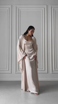 Our best-selling silky long kimono robe is a bridal and bridesmaids favorite, offering a blend of elegance and comfort, perfect for creating timeless memories while getting ready.