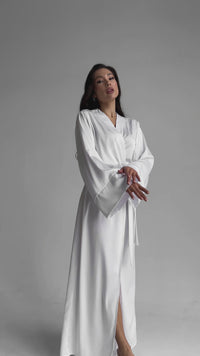 This silk long robe with straight sleeves offers a sleek and timeless design, combining luxurious comfort with understated elegance.